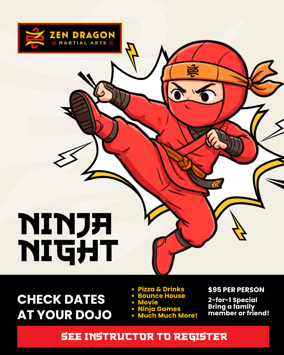 Join us for Ninja Night at your local Zen Dragon Dojo. Kids will enjoy games, challenges, and team activities while building confidence, focus, and friendships.